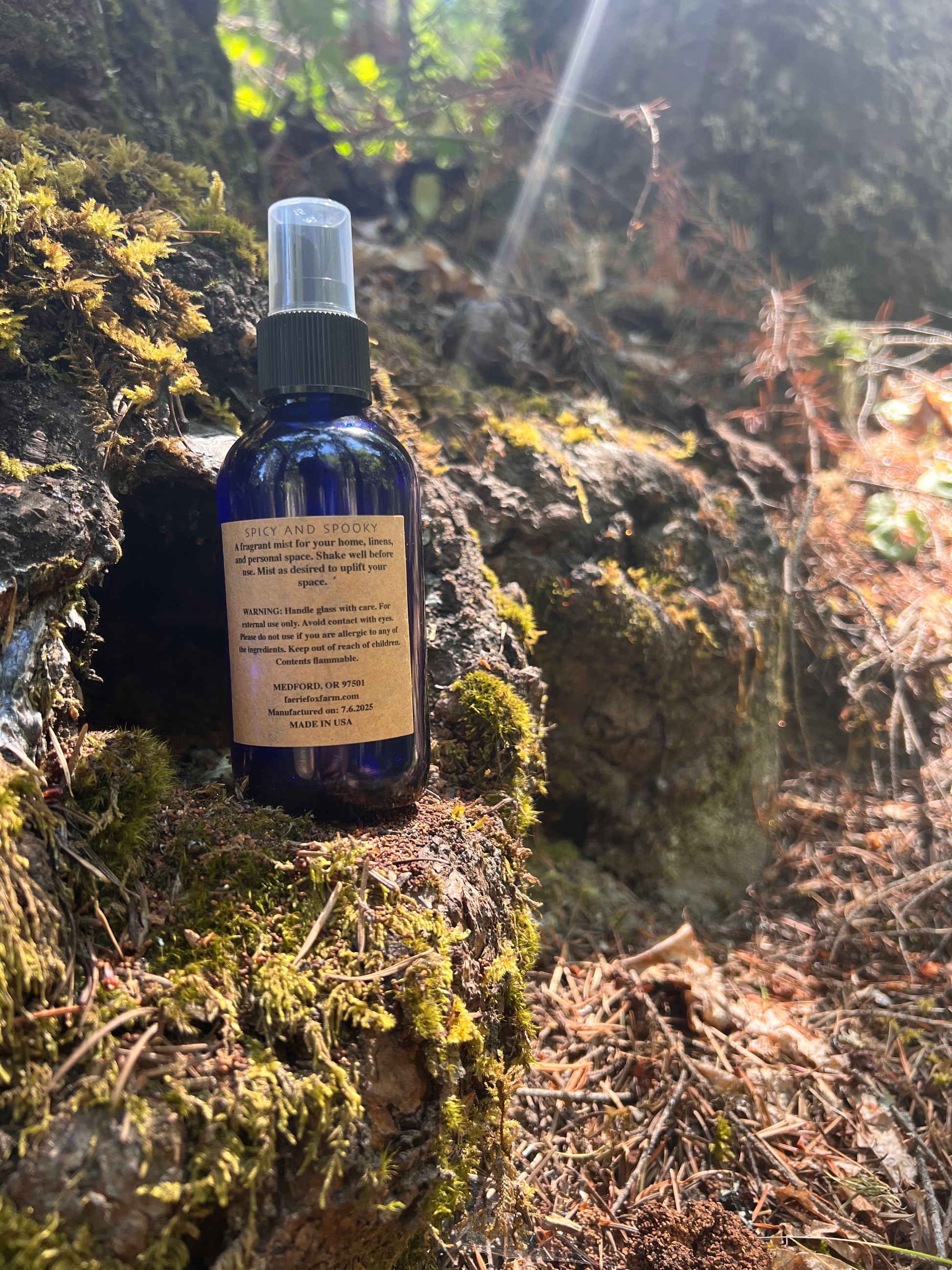 Haunted Woods is a spicy blend of clove, patchouli, cinnamon, nutmeg, ginger, and anise. It smells like spiced fall air and a walk in the woods. Hand-blended in small batches using glass packaging, this room spray is ideal for welcoming the changing of the seasons. Mist into air or on linens and enjoy the liminality of autumn.